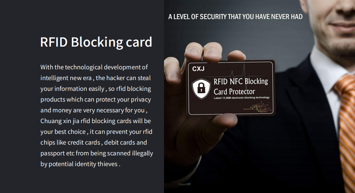 1. Security. RFID Blocking Card is powered by E-Field technology, which jams and scrambles RFID \ NFC signals, protecting your personal information from unauthorized scans.
