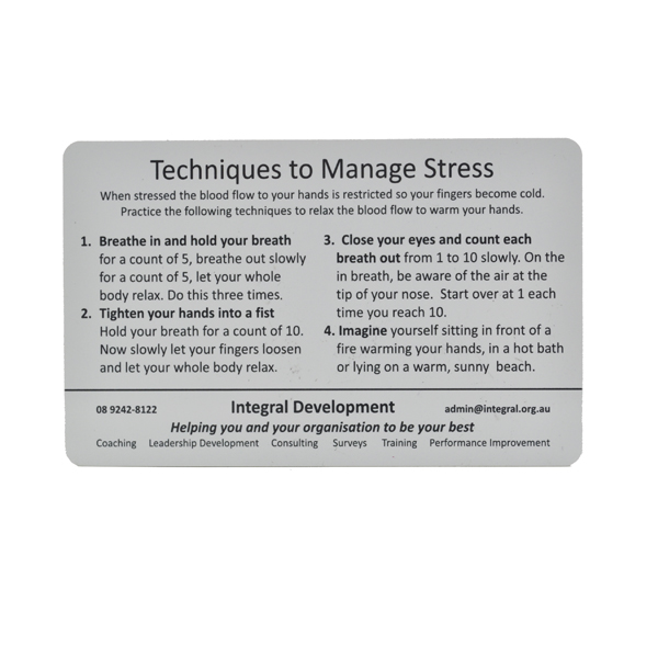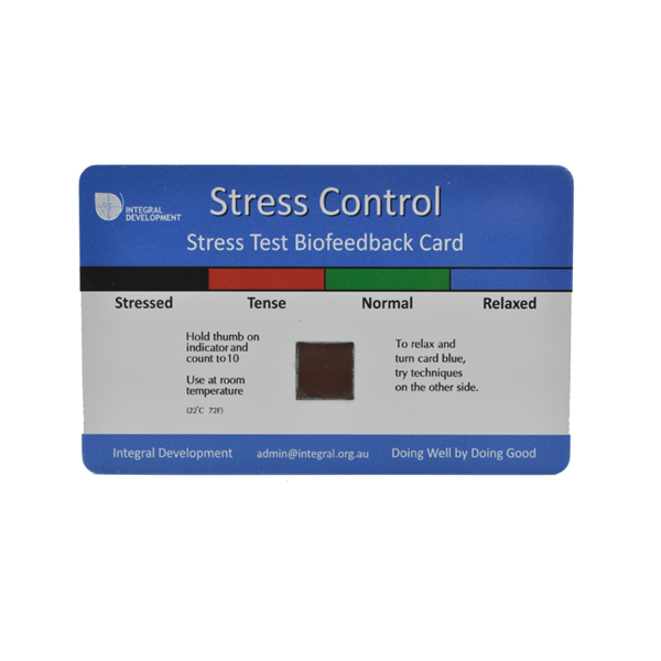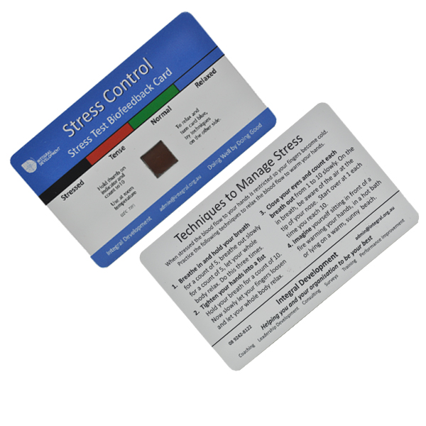 Any time or any where you can test your stress level in just 5 seconds. The plastic stress mood card are great handout to inexpensively teach students, employees, and the general public. Use at Health Fairs, Wellness Fairs and other public events. Catching stress before it builds into a headache or stomach ache or other health problem is a great life skill. With this test, you can check what your stress level is by monitoring your hand temperature. No special instrument or measurement device needed.
