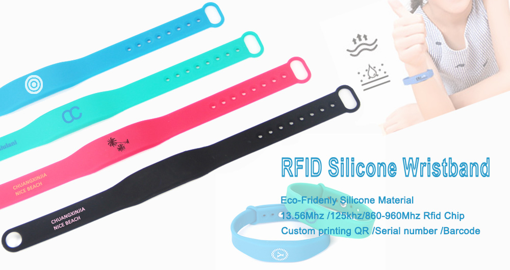 rfid wristband are IP68 waterproof, durable, eco friendly, heat resistance, and anti-allergy. All our rfid silicone nfc wristbands are available with LF 125khz, HF 13.56mhz, UHF 860-960mhz or dual frequency ICs. Widely used in door access control, member management, payment tracking, pet/lost tracking etc. Custom wristband color, custom LOGO printing all available for our RFID silicone wristband bracelet. Craft options like unique QR code, serial number, barcode, embossed, debossed, laser printing etc all accepted for RFID silicone wristband bracelet.